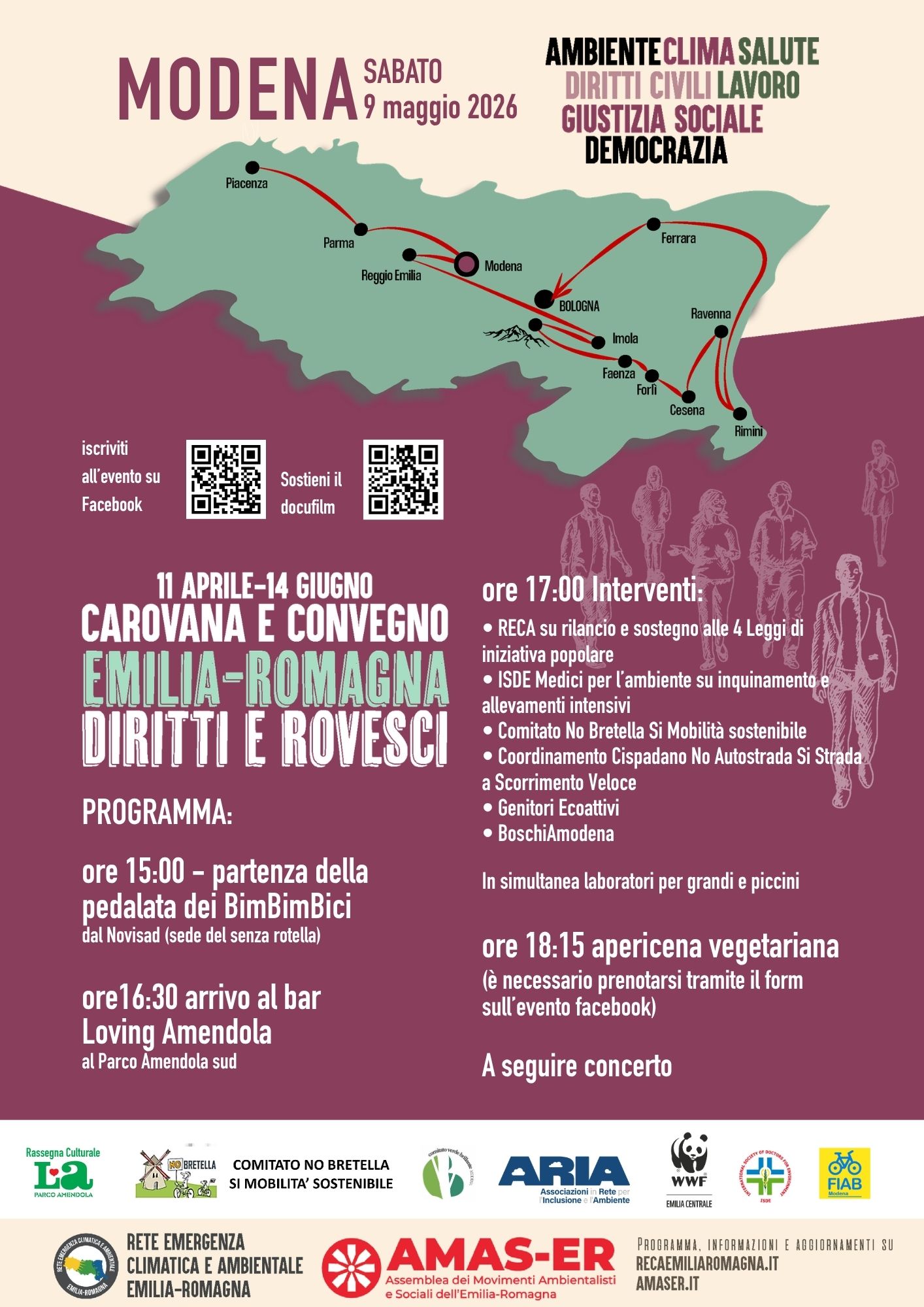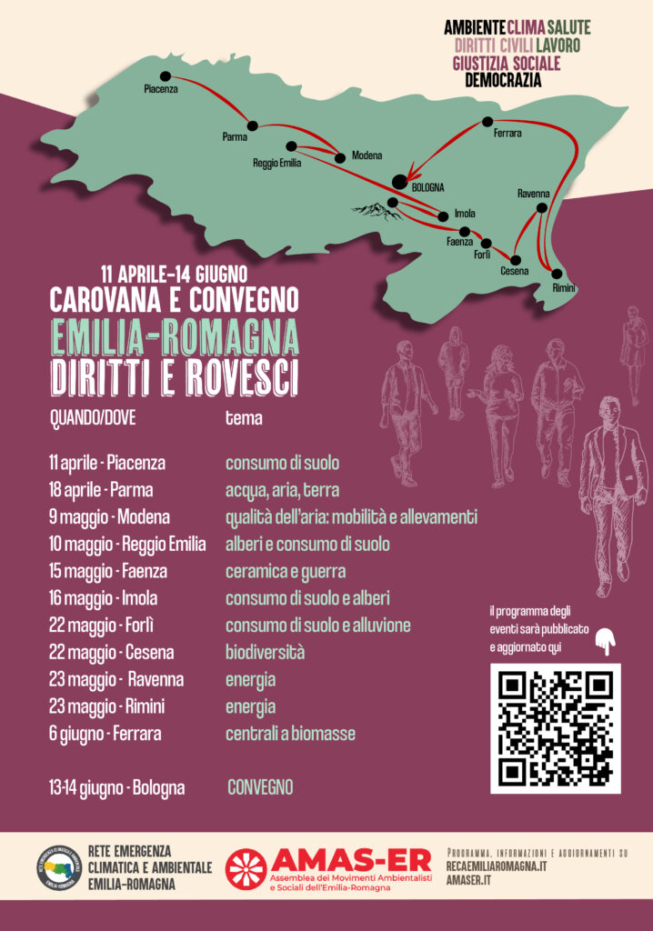 Come associazioni, comitati, collettivi e realtà sociali che ogni giorno si impegnano per denunciare e cambiare le politiche dannose per la salute, l’ambiente e la qualità di vita, abbiamo deciso di creare un’occasione per mostrare tutto il nostro lavoro attraverso una CAROVANA che partirà da Piacenza l’11 aprile per toccare poi tutti i capoluoghi di provincia e altre località significative, fino ad arrivare a Bologna il 13 e 14 giugno, dove si terrà un CONVEGNO per approfondire insieme tutte le tematiche affrontate, in cui costruiremo delle proposte concrete per affrontare la sfida ambientale, climatica e sociale.