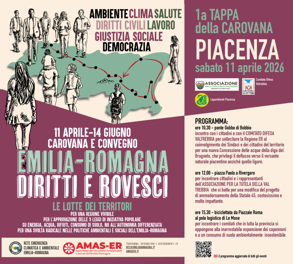 Come associazioni, comitati, collettivi e realtà sociali che ogni giorno si impegnano per denunciare e cambiare le politiche dannose per la salute, l’ambiente e la qualità di vita, abbiamo deciso di creare un’occasione per mostrare tutto il nostro lavoro attraverso una CAROVANA che partirà da Piacenza l’11 aprile per toccare poi tutti i capoluoghi di provincia e altre località significative, fino ad arrivare a Bologna il 13 e 14 giugno, dove si terrà un CONVEGNO per approfondire insieme tutte le tematiche affrontate, in cui costruiremo delle proposte concrete per affrontare la sfida ambientale, climatica e sociale.
